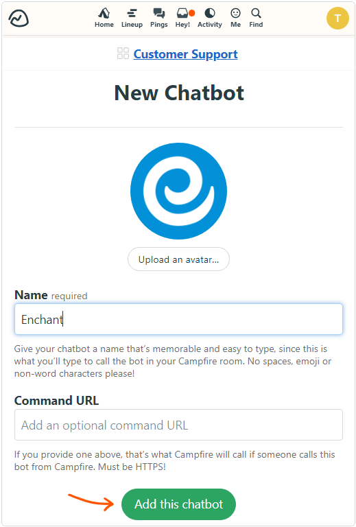 Install the Campfire app in Enchant and provide it the Chatbot URL