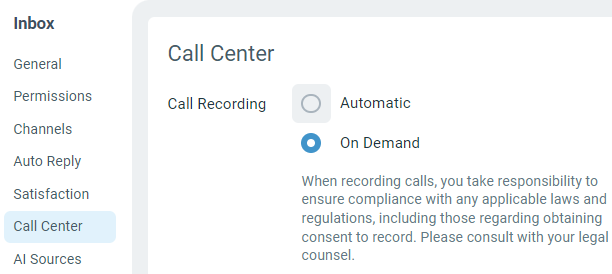 From the Call Center settings inside Inbox settings. From here, you can enable Automatic call recording. Here, all incoming and outgoing calls with automatically be recorded.