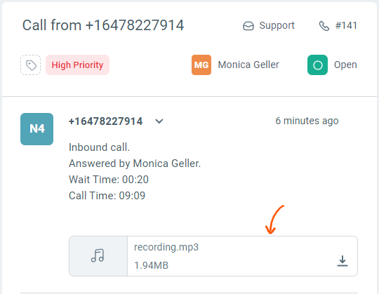 When the call ends, the recording will be attached to the ticket as an mp3 file. From here, you can click to listen to it, or download it.