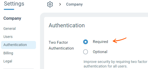 Once this setting is enabled, all users will be required to setup two factor authentication before they're able to use the system.